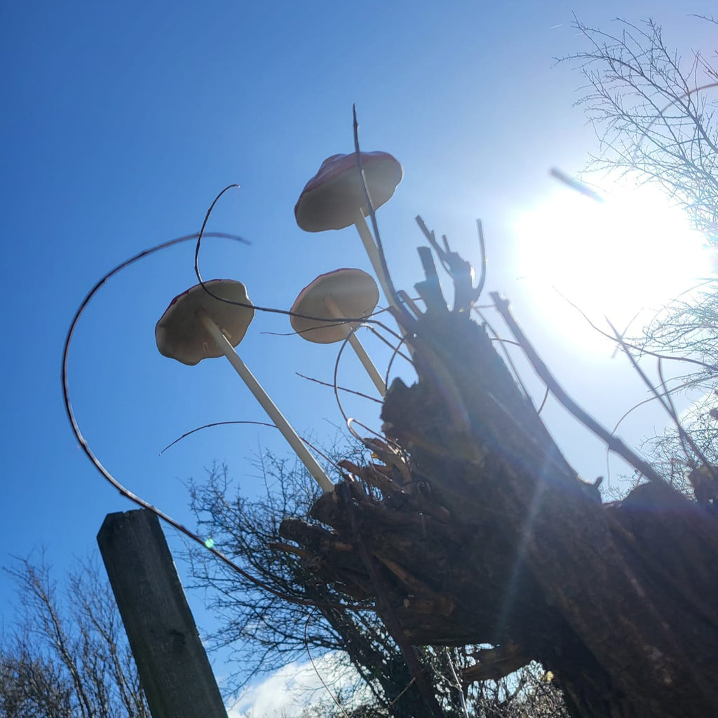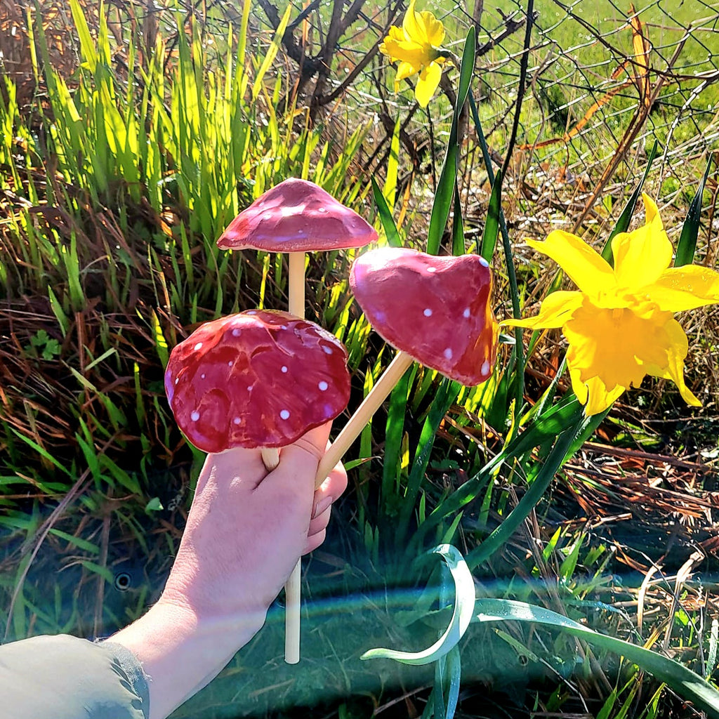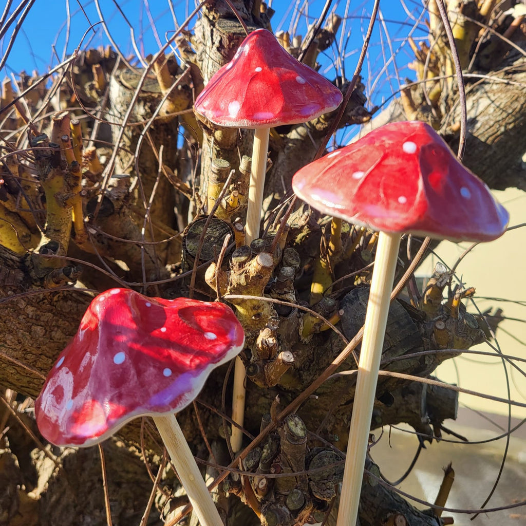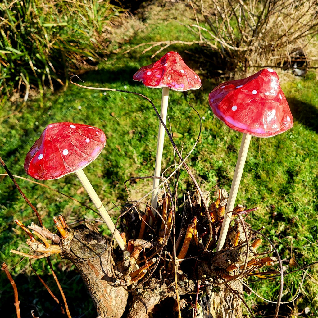 These bright red toadstool ornaments are a perfect addittion to brighten up corners of the garden. Handmade clay mushroom caps mounted on wooden stake bases, they can also be used indoors in vases or pots.