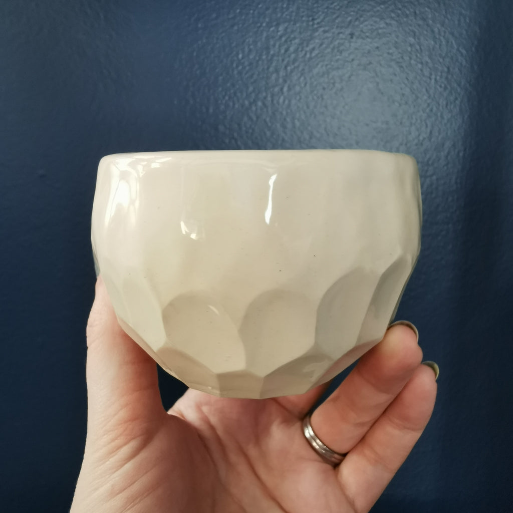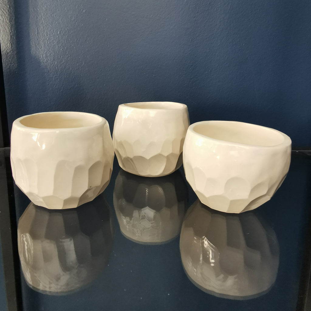 The shape of the cups makes them ideal to hold comfortably in your hand and the angles give them a textured feel. Perfect for cradling a cocktail, cacao or any drink of your choosing!